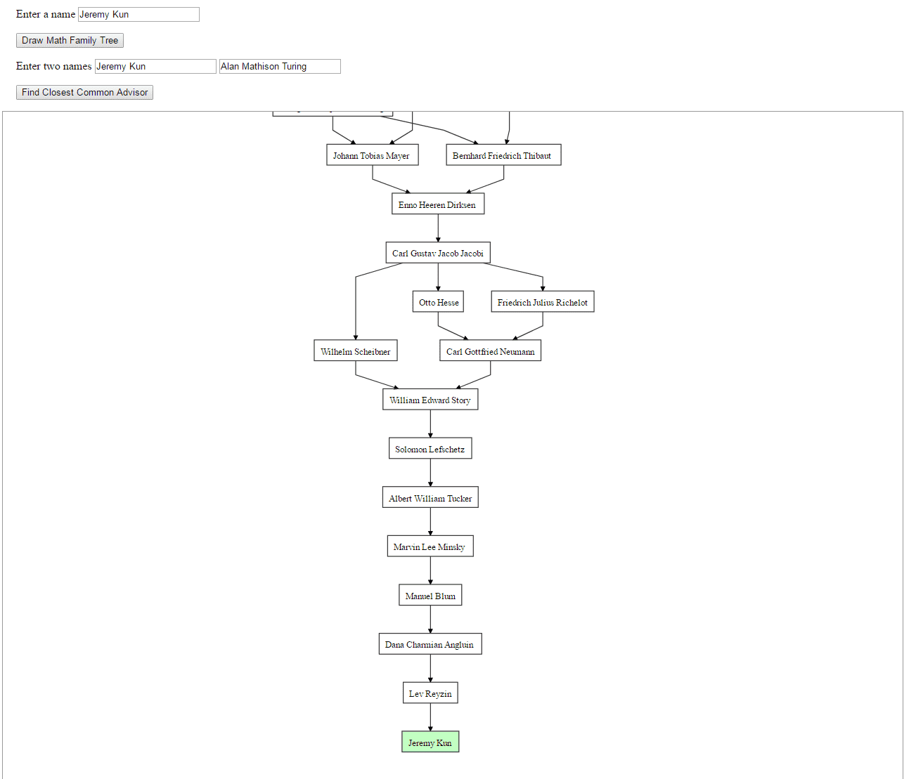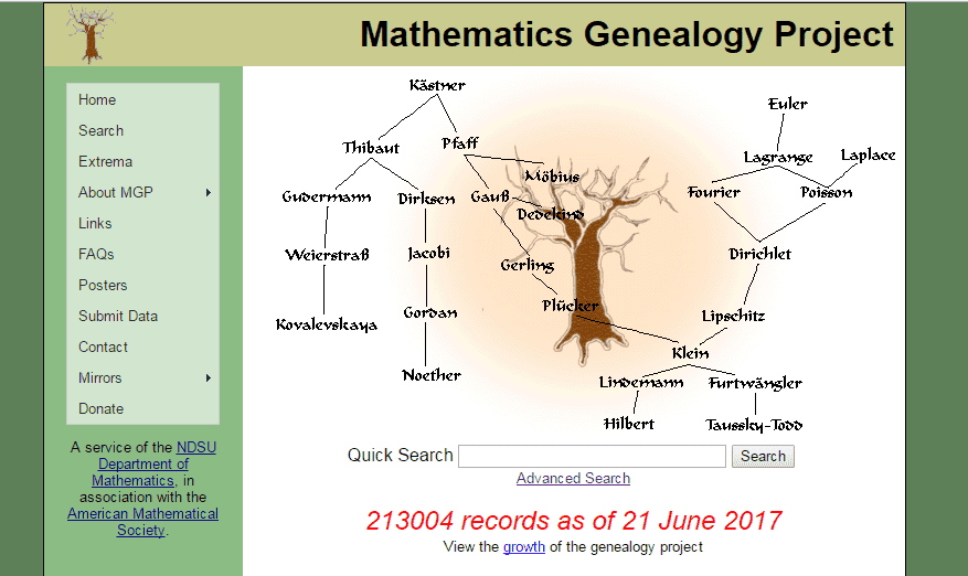 For those who don’t know, since 1996, mathematicians, starting with the labor of Harry Coonce et al, have been managing a database of all mathematicians. More specifically, they’ve been keeping track of who everyone’s thesis advisors and subsequent students were. The result is a directed graph (with a current estimated 200k nodes) that details the scientific lineage of mathematicians.